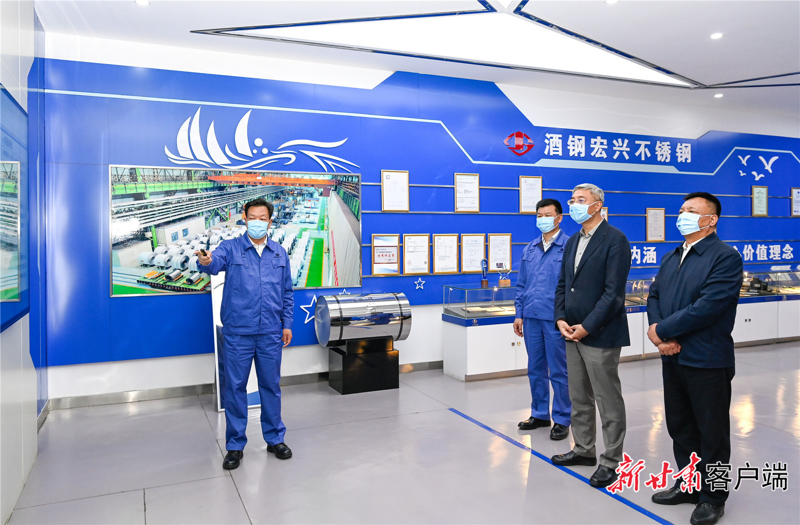 酒钢(集团)宏兴股份有限公司不锈钢分公司是国内第三家拥有炼钢、热轧到冷轧完整配套的全流程不锈钢生产企业。尹弘参观产品展示,了解酒钢集团生产经营和钢铁产业发展情况,并深入生产线察看不锈钢加工情况。他强调,碳达峰、碳中和对钢铁企业是挑战更是机遇。要抢抓新一轮能源发展机遇,坚持以供给侧结构性改革为主线,以改革创新为根本动力,加强创新链和产业链对接,推进钢铁与相关产业耦合发展,推动传统产业高端化、智能化、绿色化改造,促进全产业链优化升级。要牢固树立质量为先、品牌引领意识,瞄准市场需求、对标世界一流,加大关键核心技术攻坚力度,加快科技成果转化,以高端产品占领市场,不断提高产业实力和全球竞争力。要坚持生态优先、绿色发展,严守生态环保底线,依托我省丰富的新能源资源优势,加快节能降耗和减污降碳,持续降低碳排放强度,不断提升本质安全水平,防范各类风险隐患,推动企业绿色低碳、持续健康发展。