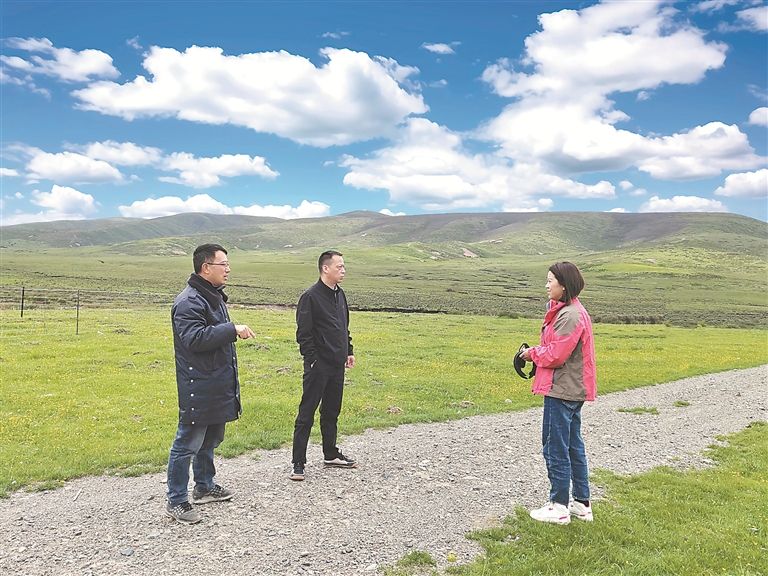 图为近日,四川省阿坝藏族羌族自治州松潘县纪委监委干部在毛儿盖镇草原村,查看黄河支流生态防护带退化草地治理项目建设推进情况。唐梦姣 摄