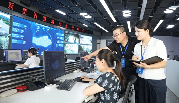 河南省登封市纪委监委在智慧城市数字管理平台增设“纪检监察监督”模块,依托大数据筛查精准发现民生诉求中的“责风腐”问题。图为该市纪检监察干部在智慧城市运行中心查看数据流转动态。康春艳 摄