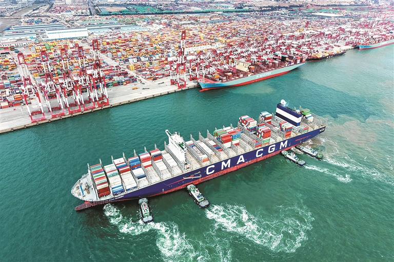 图为10月20日,在山东港口青岛港,一艘货轮在拖船辅助下停靠集装箱码头。新华社发 俞方平 摄