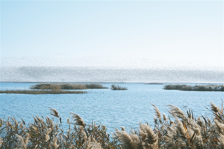 图为近日,山东黄河三角洲国家级自然保护区内,数万只花脸鸭腾空而起,掀起“鸟浪”。 记者 瞿芃 摄