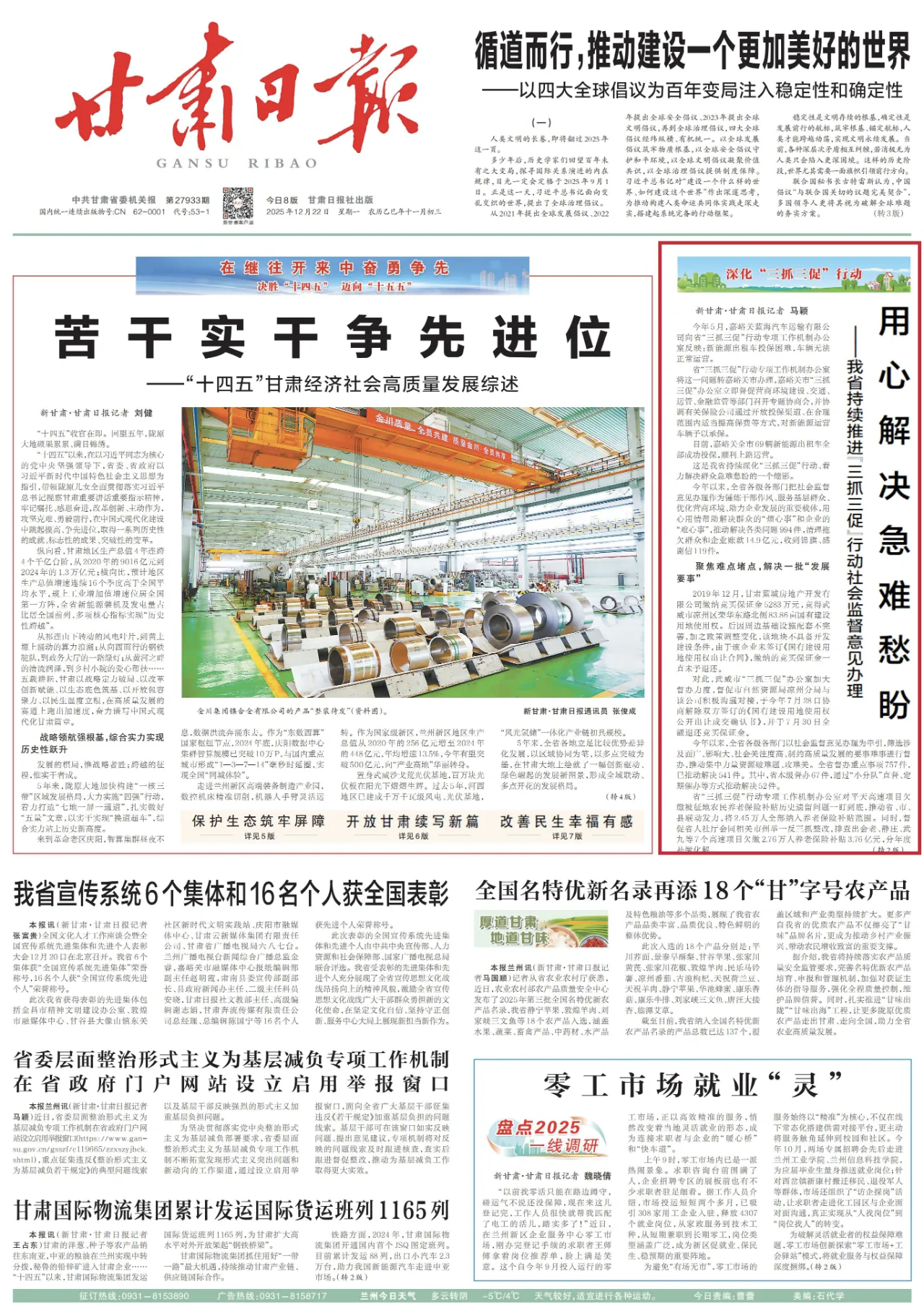 我省各级各部门紧盯安居难、用水难、出行难、讨薪难等涉及群众切身利益的问题,通过制定理好旧账、即收即办、拓宽渠道、协同联动、直查直办、提醒通报、定期督查等7项措施,实行“即收即办、十日办结”工作制,先后解决群众急难愁盼问题479件,群众对“三抓三促”行动成效更加有感。