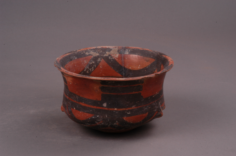 马家窑文化马厂类型,征集。高9厘米,口径15.5厘米,底径5.7厘米。大口,口沿外翻,直壁微内收、下部较宽、斜内收,小平底,双耳。器身红衣黑彩。外口沿下绘四组“☰”纹、下腹绘双线条垂弧纹、中间用双弦纹隔开。