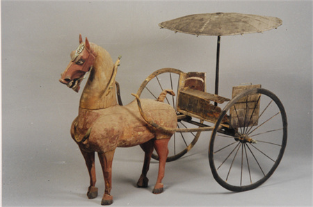 汉代,武威市磨嘴子汉墓出士。马高88.2厘米,长78.8厘米;车高95.2厘米,长96.5厘米。由舆车、伞盖、御奴和马组成。舆车有双辕,双轮各有辐条16根。御奴跪坐,作双手持缰状,以黑、白两色勾出眼、鼻及冠服。马用红、白、黑三色彩绘,头部有铜当卢、兽面饰衔嚼一副,颈上套轭。据汉代制度,此车为六百石至千石官吏乘坐的车。