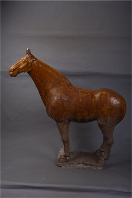 唐代,秦安叶家堡出土,高90.5厘米,长92厘米,宽27厘米。红陶模制粘合而成,马四足站立于方形踏板上,通体饰黄釉,塑造出膘肥体壮的骏马造型。