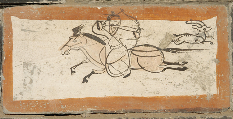 魏晋时期,嘉峪关市新城魏晋5号墓出土。长35.5厘米,宽17厘米。砖呈长方形,白粉涂底,土红色勾勒边框,墨线描绘。画面绘一猎人骑红色短鬃马,手握弓箭,正张弓回射奔逃的野羊。野羊四蹄腾空,作飞奔状。